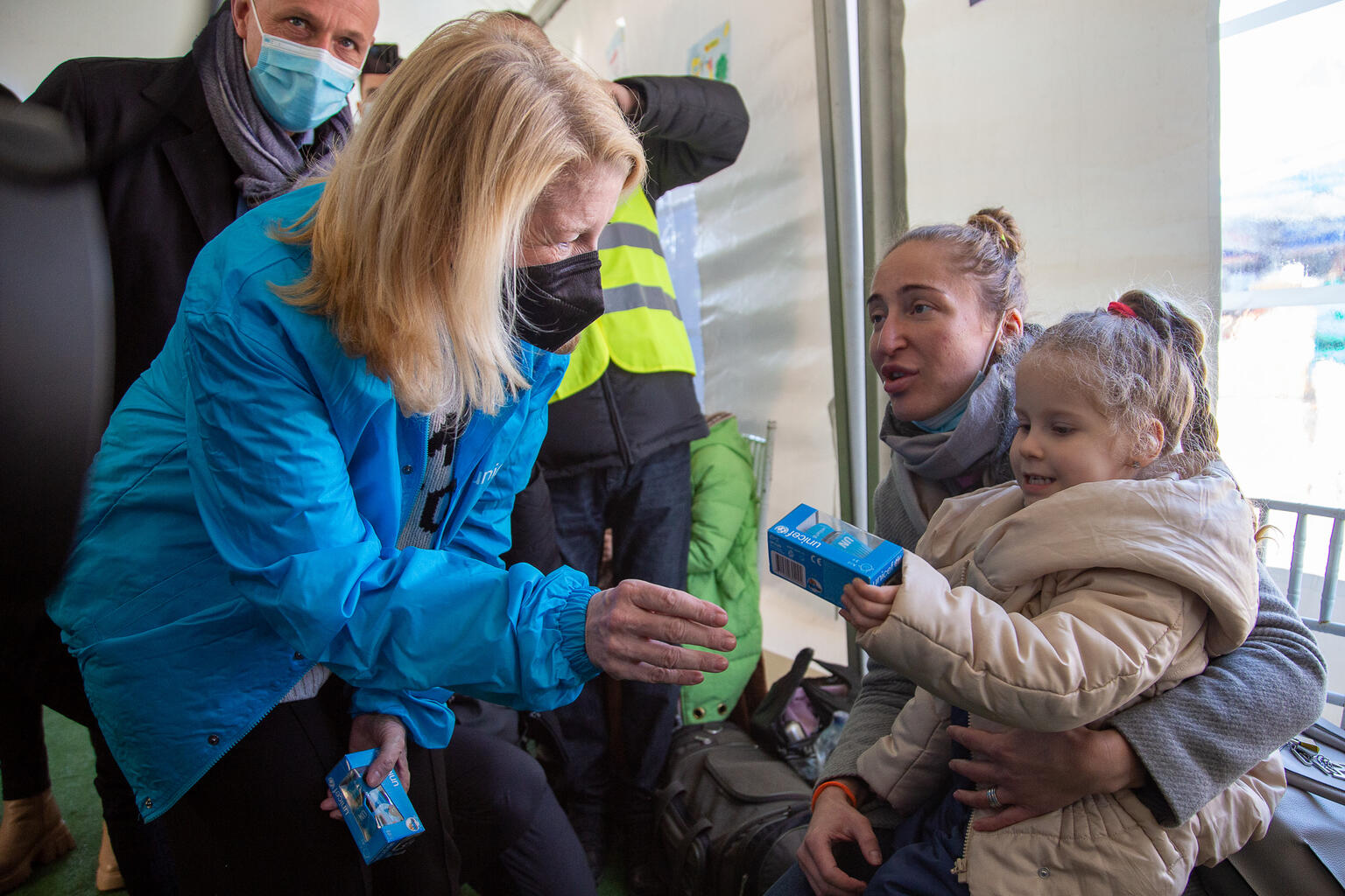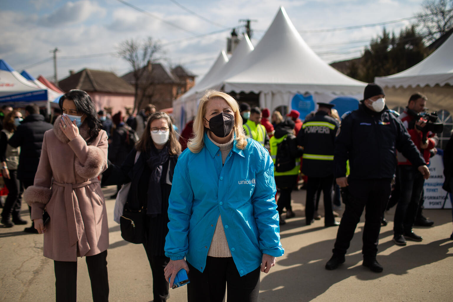 Catherine Russell, framkvæmdastjóri UNICEF, Barnahjálpar Sameinuðu þjóðanna, heimsótti einn þessara Bláu punkta á landamærum Úkraínu og Rúmeníu í gær og hrósaði rúmenskum stjórnvöldum og almenningi þar fyrir að taka svo vel á móti flóttafólki frá Úkraínu. Meðfylgjandi myndir eru frá þeirri heimsókn.