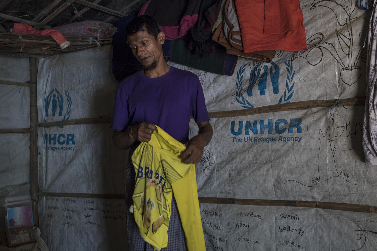 Salim Taallah (á mynd hér fyrir ofan) heldur á fótboltatreyju sonar síns, hins tólf ára gamla Korimullah. Fyrir sex mánuðum síðan fór Korimullah út að leika sér skammt frá heimili fjölskyldunnar í Balukhali-búðunum í Cox‘s Bazar. Hann hefur ekki sést síðan.