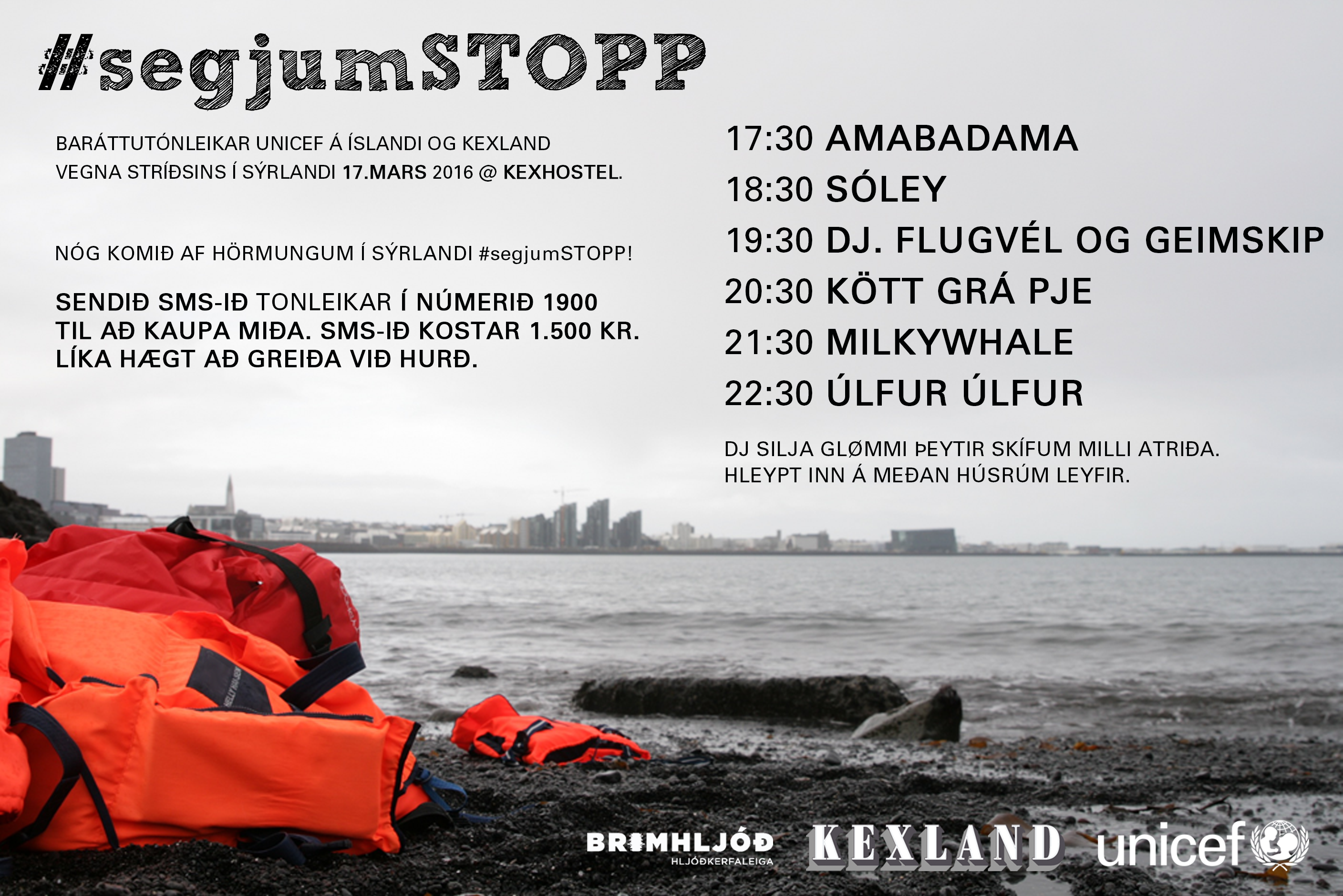 Aðgangseyririnn rennur í neyðarsöfnun UNICEF á Íslandi. Hljómsveitirnar gefa vinnu sína og KEX Land útvegar aðstöðu og allt sem þarf. Dagskráin er eftirfarandi: