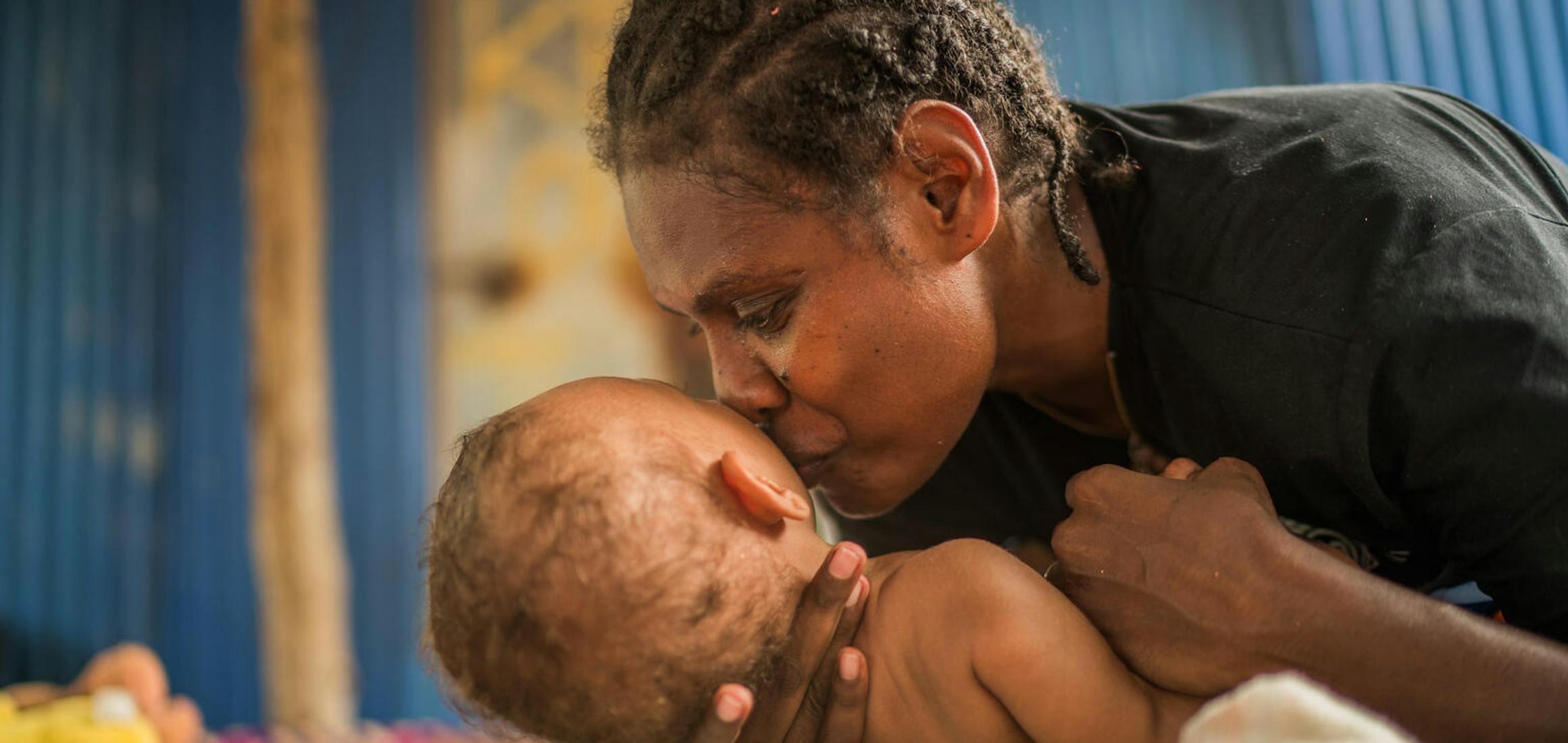 Priscilla baðar 9 mánaða gamlan son sinn Killion á heimili þeirra í eyjaþorpinu Lelepa í Vanuatu. Mynd: UNICEF/UNI797949