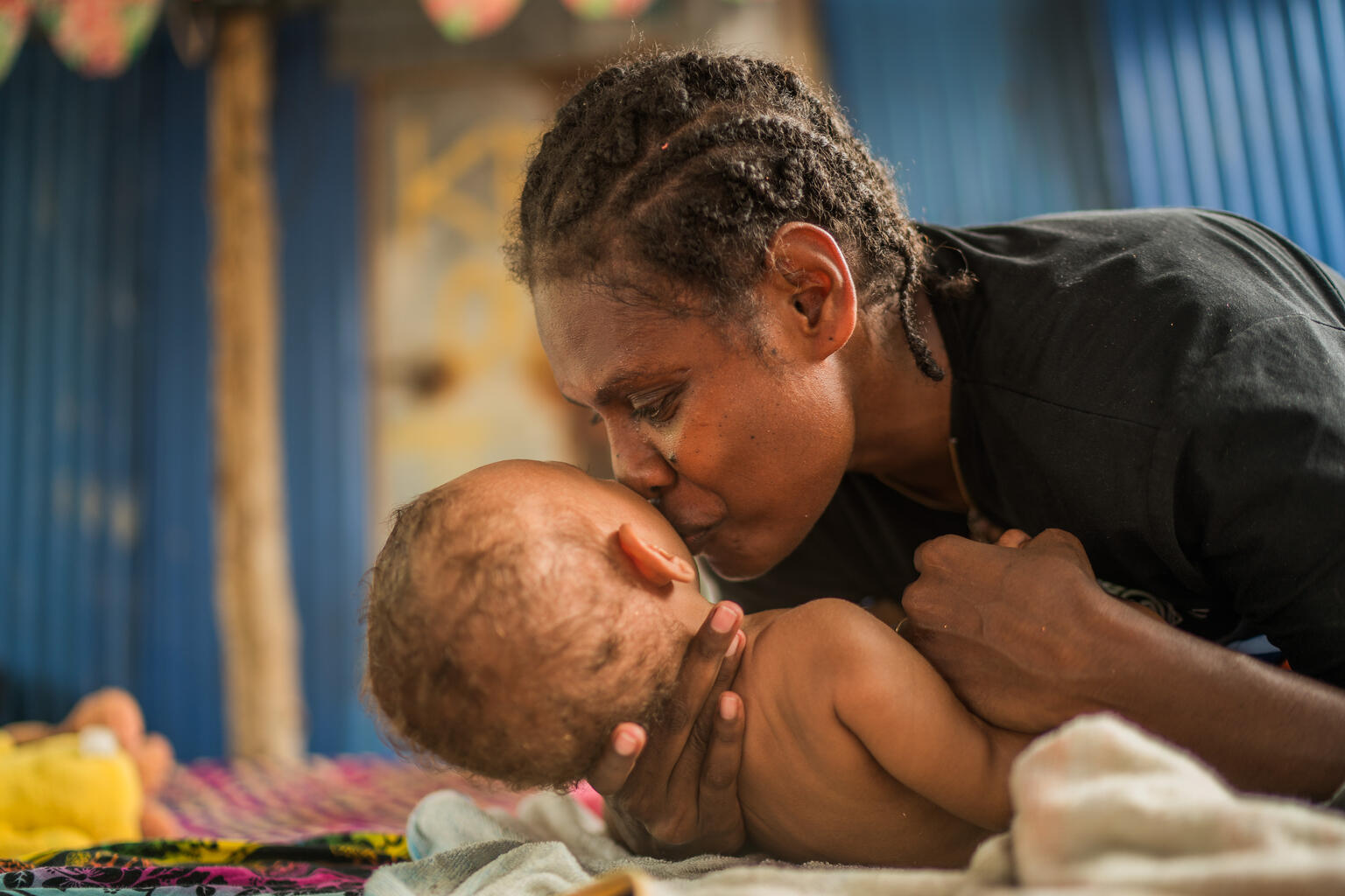 Priscilla baðar 9 mánaða gamlan son sinn Killion á heimili þeirra í eyjaþorpinu Lelepa í Vanuatu. Mynd: UNICEF/UNI797949